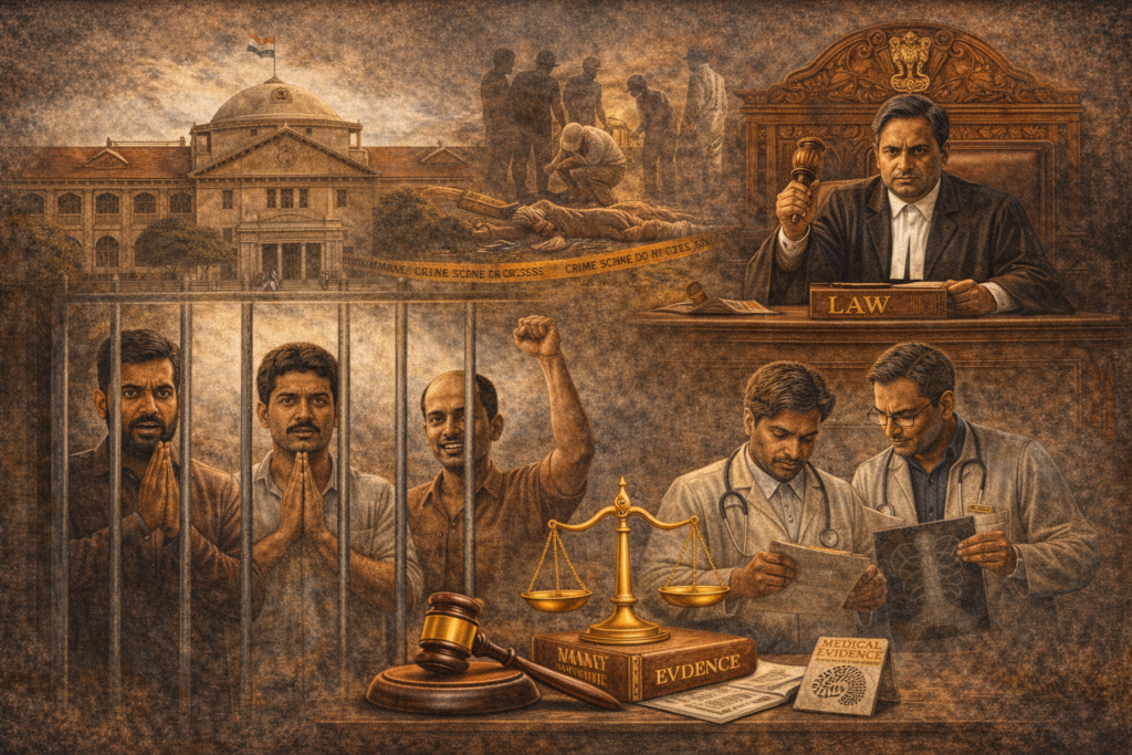 भारतीय आपराधिक न्याय व्यवस्था में इलाहाबाद उच्च न्यायालय का हालिया निर्णय एक अत्यंत महत्वपूर्ण नज़ीर (precedent) के रूप में सामने आया है। अदालत ने एक ‘ब्लाइंड मर्डर’ (Blind Murder) केस में आजीवन कारावास की सज़ा काट रहे तीन अभियुक्तों को बरी कर दिया, यह कहते हुए कि अभियोजन की कहानी गंभीर विरोधाभासों से भरी हुई है और चिकित्सकीय साक्ष्य (Medical Evidence) अभियोजन के मुख्य दावों का समर्थन नहीं करता। हाईकोर्ट ने दो टूक शब्दों में कहा कि केवल संदेह या परिस्थितिजन्य अनुमानों के आधार पर किसी व्यक्ति को दोषी ठहराया नहीं जा सकता, बल्कि अपराध को संदेह से परे (Beyond Reasonable Doubt) सिद्ध करना अभियोजन का कर्तव्य है।