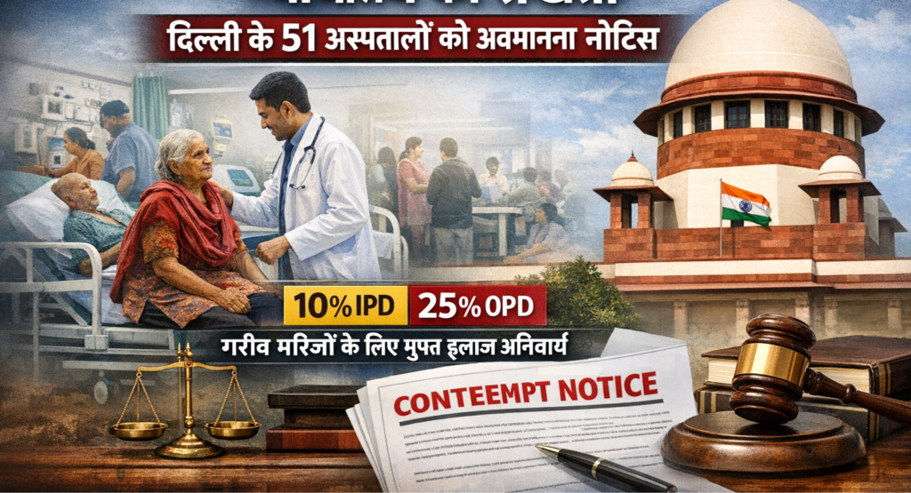 भारत में स्वास्थ्य सेवा केवल एक सुविधा नहीं, बल्कि गरिमापूर्ण जीवन के अधिकार का अभिन्न हिस्सा है। जब निजी अस्पतालों को रियायती दर पर सरकारी भूमि या अन्य रियायतें दी जाती हैं, तो बदले में उनसे अपेक्षा की जाती है कि वे समाज के कमजोर वर्गों के लिए कुछ प्रतिशत बेड और ओपीडी सेवाएं निःशुल्क उपलब्ध कराएँ। इसी संदर्भ में हाल ही में Supreme Court of India ने दिल्ली के 51 निजी अस्पतालों को अवमानना नोटिस जारी किया, क्योंकि उन्होंने गरीब मरीजों के लिए न्यूनतम 10% आईपीडी और 25% ओपीडी सेवाएं मुफ्त उपलब्ध कराने की शर्त का पालन नहीं किया। यह कदम केवल प्रशासनिक कार्यवाही नहीं, बल्कि सामाजिक न्याय की दिशा में न्यायपालिका की सक्रियता का प्रतीक है।